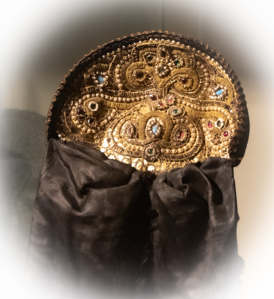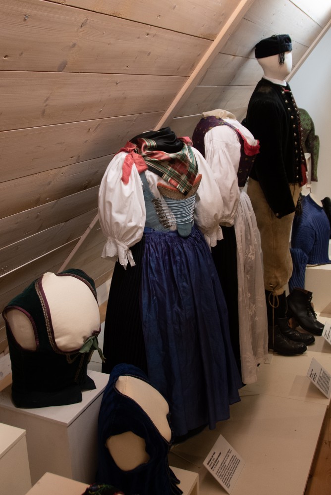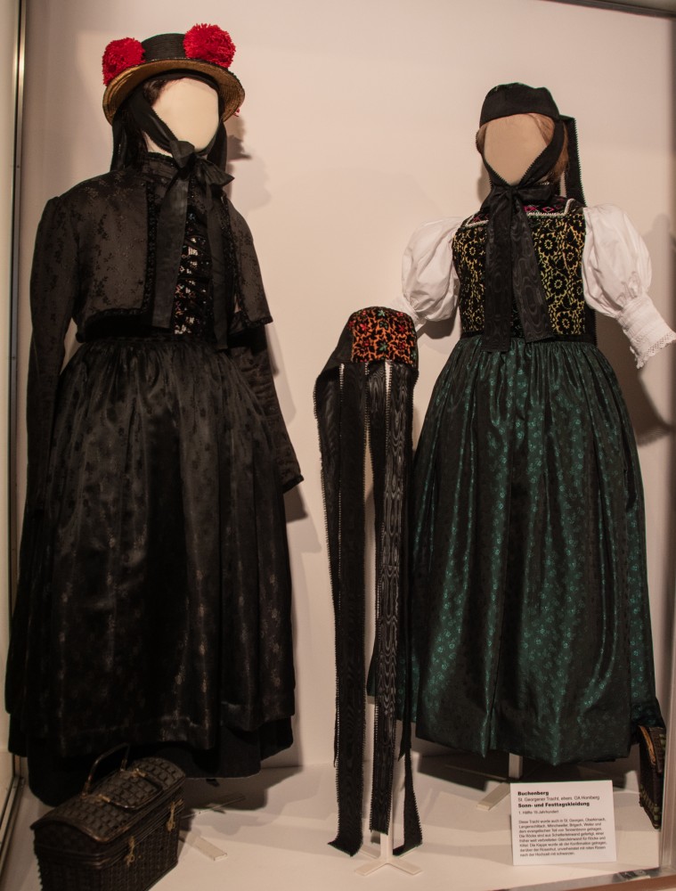 Bis zum Ende des 19. Jahrhunderts wurde die Kleidung nüchterner und dunkler, Mieder waren weitestgehend hochgeschlossen, doch in den fein bestickten schwarzen Samtleible hat sich das Biedermeier erhalten. Um die Jahrhundertwende bediente man sich noch einmal bei der städtischen Mode und so finden sich heute in den Nachlässen oft die für diese Zeit typischen Frauenjacken als Zubehör zur Tracht. Zu den ältesten Stücken im Museum gehört, z.B. ein hellblaues Seidenmieder aus Eutingen. Gerade von den Eutinger Trachten sind in den Stilen des 19. Jahrhunderts viele Stücke gut erhalten und ermöglichen es uns, anhand der Tracht dieses Ortes, die Veränderungen von Form und Material zu zeigen. An Festtagen wurden zur Tracht kostbare Hauben – in Eutingen z.B. mit Brokatstickerei – getragen. Im Alltag hingegen, nutzte die Bäuerin je nachdem, was sie tat und wo sie hin wollte, verschiedene Kopftücher. Lediglich bei Hochzeiten, Beerdigungen oder an Feiertagen wurde die Tracht aufwendiger und kostbarer. Auch die Hauben wurden nur zu diesen Anlässen in der Kirche oder bei Familienfesten getragen.