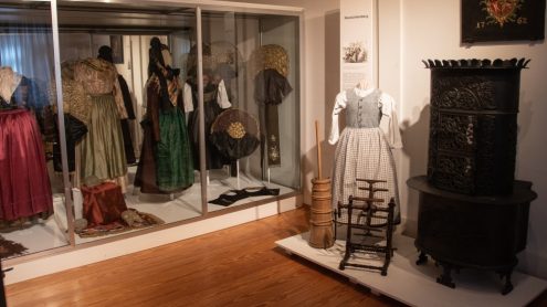 Dadurch wurde es möglich, zwei Projekte umzusetzen. Zum einen, eine interaktive Karte, auf der sich mittels eines Touchscreens Informationen über Verbreitung und Bedeutung der Kleidungsstücke abrufen lassen. Zum anderen lässt eine Audiostation die Trachten buchstäblich sprechen. Mode, Dorftratsch und Hochzeit sind die drei Alltagssituationen, die da auf schwäbisch zu hören sind. Beim Anhören dieser Dialoge, zwischen den verschiedensten „Albtrachten“, bekommt man eine Vorstellung davon, wie es früher gewesen sein könnte. Ergänzt wird das Bild von einer einzigartigen Spende, die die gesamte Kleidung aus dem Besitz von Katharina Bückle (1916 – 2014) aus Bernstadt (Alb-Donau-Kreis) umfasst. Darunter ihr seidenes Hochzeitskleid in Schwarz, damals die übliche Hochzeitsfarbe. Die Tracht ist ein Teil der Alltagsgeschichte unserer Heimat. Inzwischen gibt es kaum noch Zeitzeugen und so kann beim Recherchieren nur noch auf schriftliche Quellen oder Bilder zurückgegriffen werden, deren Informationen aber nur teilweise der Realität entsprechen. Archivierung und Recherche sind ein grosser Teil der Museumsarbeit.